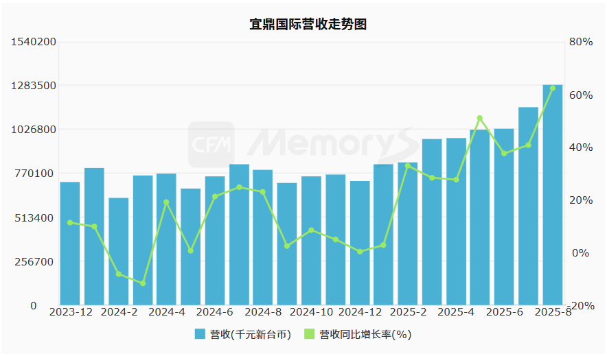 宜鼎国际8月合并营收12.83 亿元(新台币,下同),环比增长11.28%,同比增长62.55%,连续两个月创下新高。
