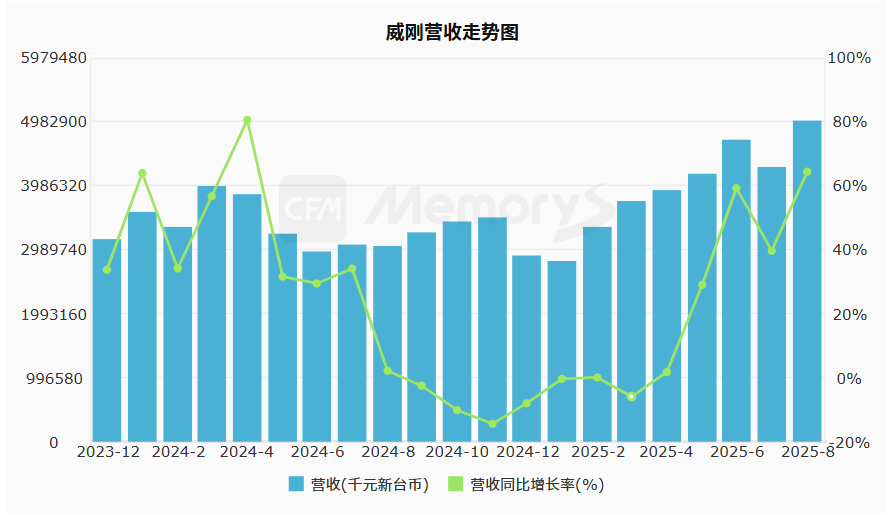 受惠价量齐扬,威刚8月营收49.83亿元(新台币,下同),环比增长17%,同比增长65%;累计今年1-8月营收319.28亿元、同比增长18.29%。