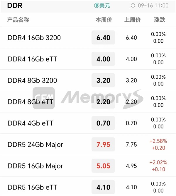 上游资源方面,上周四多数Flash Wafer价格上涨,1Tb QLC/1Tb TLC/512Gb TLC NAND Flash Wafer价格分别调涨2.1%/1.9%/3.2%至4.90/5.50/3.20美元,今日Flash Wafer价格持平;部分DDR5颗粒价格调涨,其中,DDR5 16Gb/24Gb Major价格分别调整至5.05/7.95美元,其他DDR颗粒价格不变。