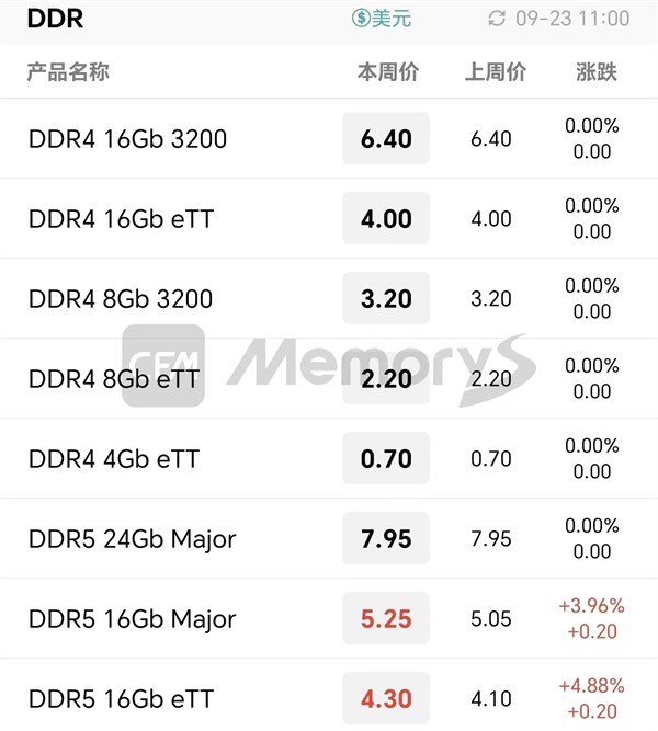上游资源方面,上周五Flash Wafer价格全面上涨,1Tb QLC/1Tb /512Gb/256Gb TLC NAND Flash Wafer价格分别调涨至5.00/5.60/3.40/3.10美元,今日Flash Wafer价格持平;部分DDR5颗粒价格调涨,其中,DDR5 16Gb Major/eTT价格调整至5.25/4.30美元,其他DDR颗粒价格不变。