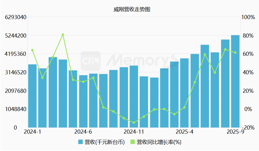 威刚9月营收突破50亿元(新台币,下同),达52.44亿元,环比增长5.24%,同比增长61.18%,创近19年来单月新高。