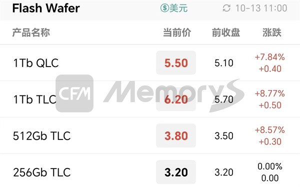 据CFM闪存市场最新报价,今日开盘,1Tb QLC 涨 7.84% 至 $5.50,1Tb TLC 涨 8.77% 至 $6.20,512Gb TLC 涨 8.57% 至 $3.80。