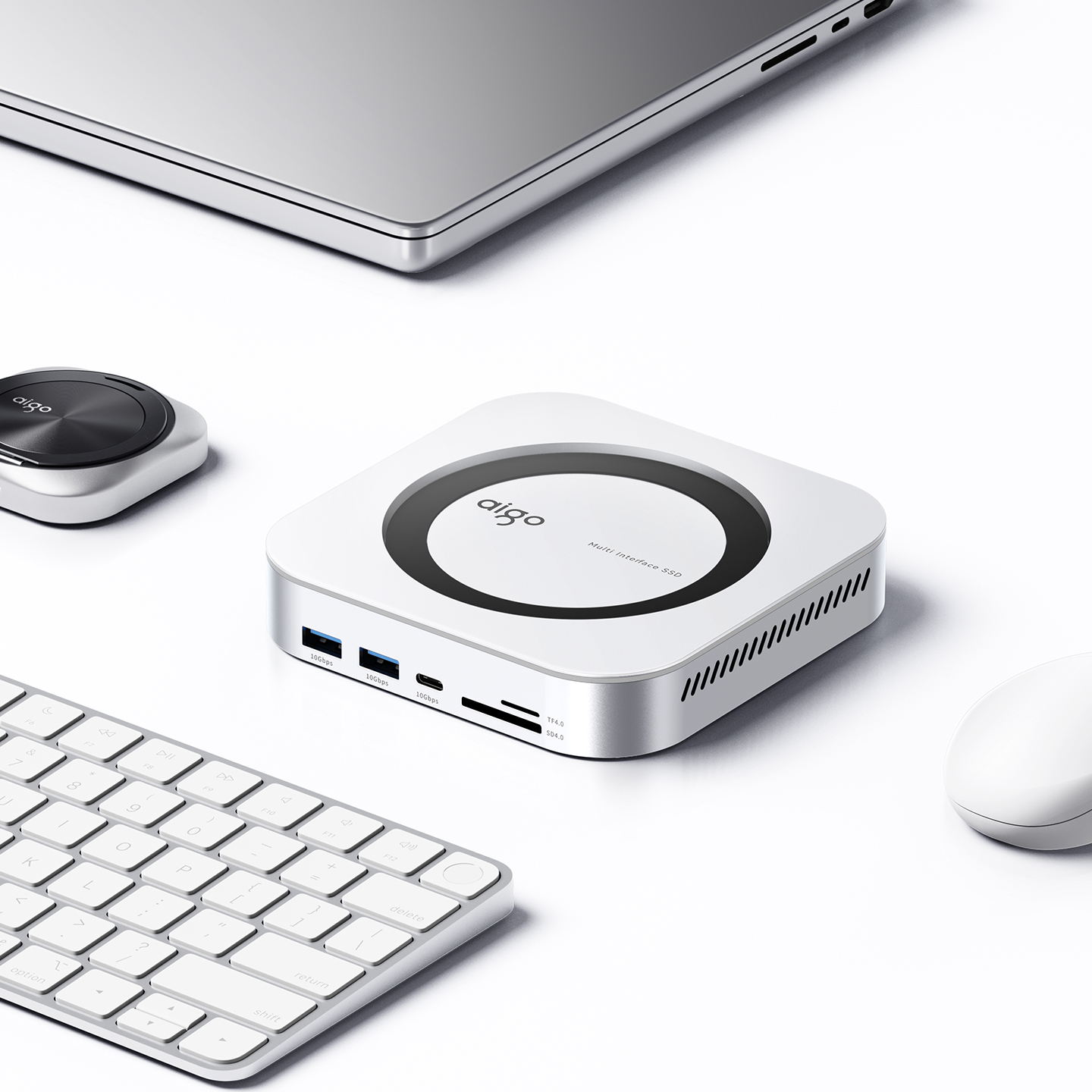 H2在设计上体现了aigo对“美学新设计”和“突破边界”的深刻理解 。其外形尺寸与Mac mini M4新机型实现了1:1的精准对齐 。这种精心考量的叠放设计,不仅最大限度地节省了桌面空间,更在视觉上与Mac mini形成了完美的“黄金搭档” 。H2的设计哲学是成为“苹果生态的延伸”,而非一个突兀的独立配件。它选择了与苹果的极简美学高度融合,从太空银的细腻喷砂到原厂质感的铝合金材质,都旨在实现99.99%的原厂质感 。