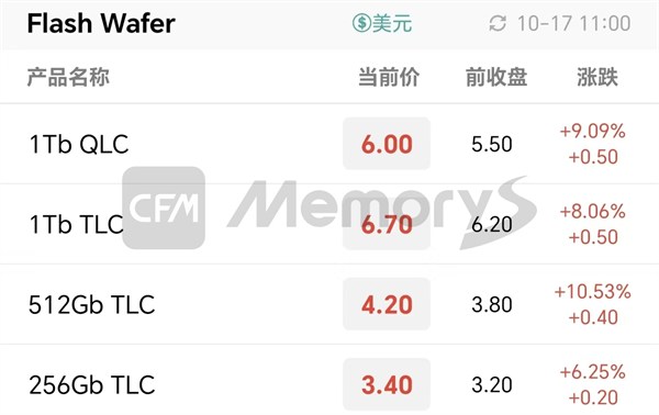 据CFM闪存市场最新报价,1Tb QLC 涨 9.09% 至 $6.00,1Tb TLC 涨 8.06% 至 $6.70,512Gb TLC 涨 10.53% 至 $4.20,256Gb TLC 涨 6.25% 至 $3.40。