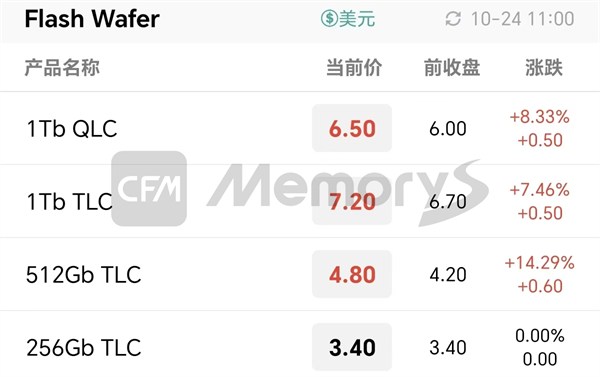 据CFM闪存市场最新报价,1Tb QLC 涨 8.33% 至 $6.50,1Tb TLC 涨 7.46% 至 $7.20,512Gb TLC 涨 14.29% 至 $4.80。