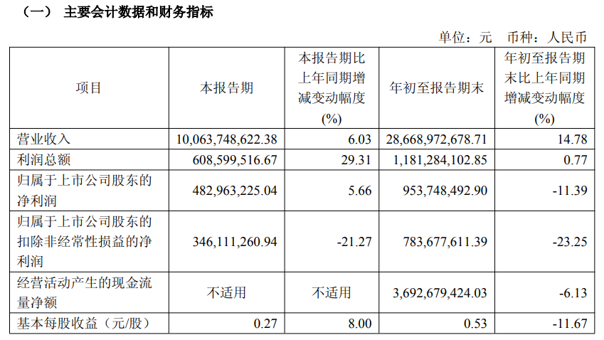 长电科技发布2025年三季报。第三季度营业收入100.64亿元,同比增长6.03%;净利润4.83亿元,同比增长5.66%。前三季度营业收入286.69亿元,同比增长14.78%;净利润9.54亿元,同比下降11.39%;基本每股收益0.53元。