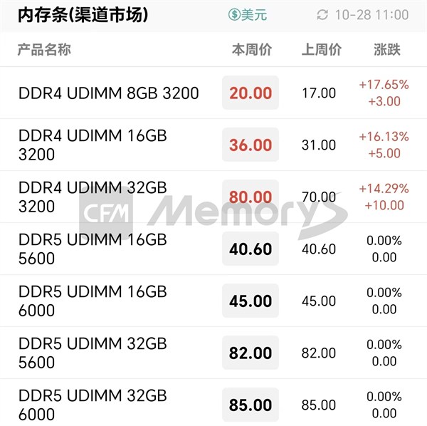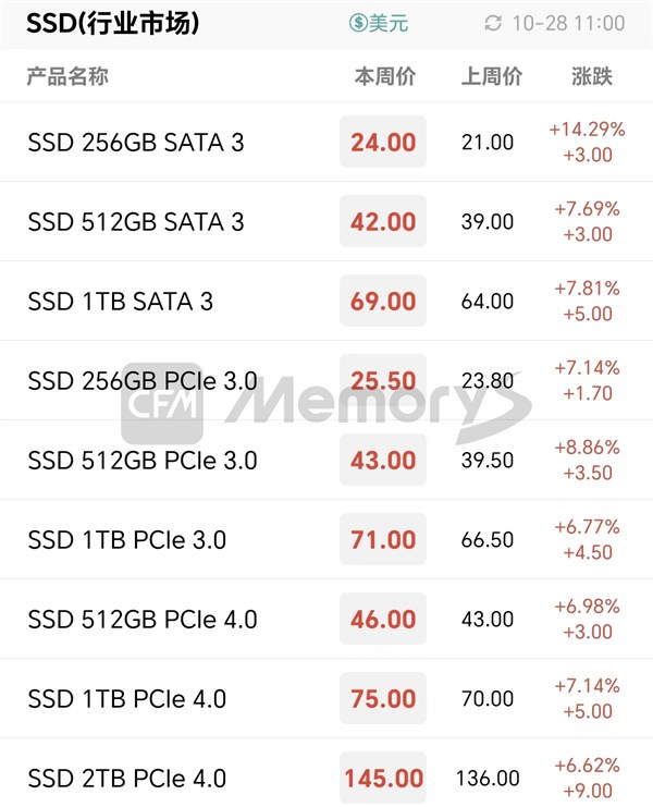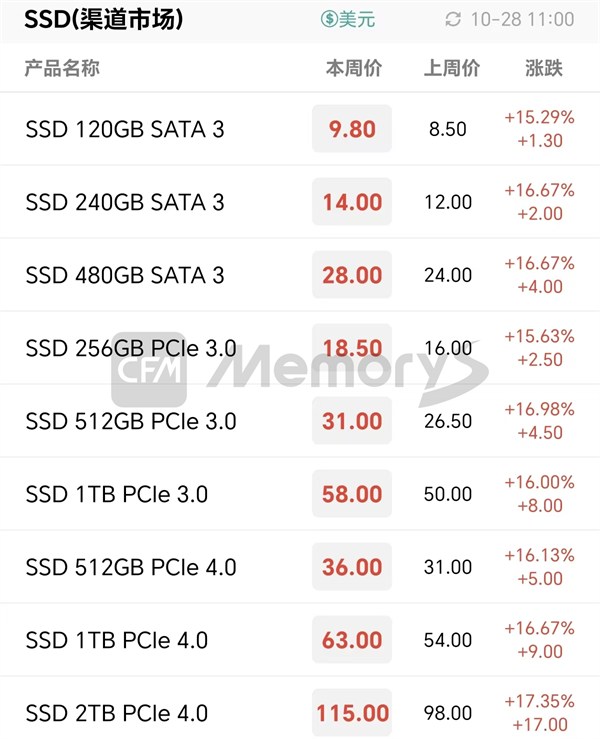 伴随着长达近两个月资源端持续控货,包括低端资源在内的NAND、DDR颗粒价格全面大幅拉涨,贸易商更是伺机而动哄抬报价,动辄翻倍增长的比比皆是。目前,市面上流通资源仍非常稀少,渠道厂商尽管有补库需求,但无奈价格太高且供应非常有限,多数仅能以旧库存维持生产。基于NAND、DDR资源仍维持控货抬价,部分渠道厂商针对相应的成品大幅上调报价,接单意愿较为低迷。当然,价格过高的产品往往较难达成交易。本周渠道SSD、DDR4内存条价格续涨。