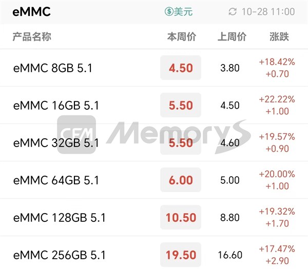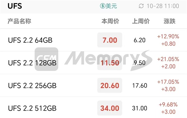 尽管原厂NAND资源供应量、价均尚未有定论,但从现货NAND资源价格来看,9月至至今,512Gb TLC/1Tb TLC/QLC NAND普遍价格累计涨超近40%。资源涨价效应带动下,存储厂商继续大幅调高嵌入式eMMC、UFS产品报价。由于报价过高,仅个别容量的嵌入式NAND成品有小单成交。而存储产品大幅涨价带来的成本压力已对手机厂商造成实质性影响,倒逼部分手机机型不得已采用降容策略来平铺生产成本。