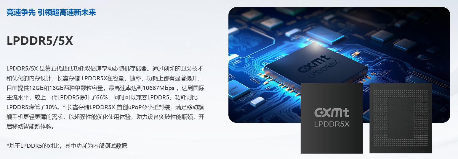 通过创新的封装技术和优化的内存设计,长鑫存储 LPDDR5X在容量、速率、功耗上都有显著提升,目前提供12Gb和16Gb两种单颗粒容量,最高速率达到10667Mbps ,达到国际主流水平,较上一代LPDDR5提升了66%,同时可以兼容LPDDR5,功耗则比LPDDR5降低了30%。长鑫存储LPDDR5X 首创uPoP®小型封装,满足移动旗舰手机更轻更薄的需求,以超强性能优化使用体验,助力设备突破性能瓶颈,开启移动智能新体验。