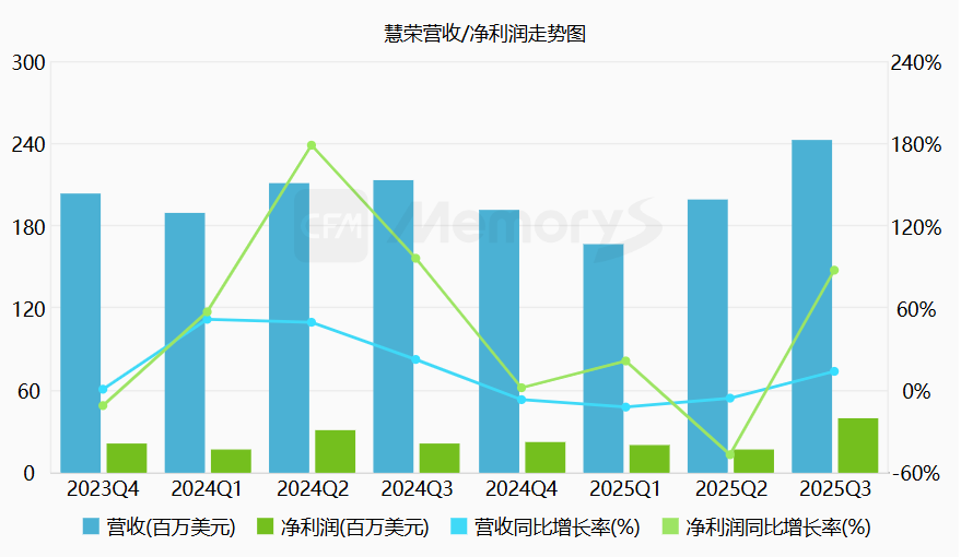 慧荣科技2025年第三季财报显示,营收2.42亿美元,环比增长 22%、同比增长14%;毛利率为 48.7%;税后净利润为 3382 万美元。
