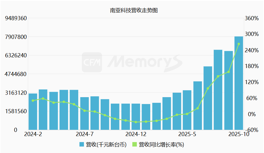 南亚科技10月营收79.08亿元(新台币,下同),环比增长18.66%,同比大增262.37%,创四年多以来的新高。累计今年1-10月营收444.01亿元,同比增长49.3%。