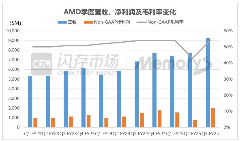 AMD发布2025年第三季度(截至2025年9月27日)财报:营收92.46亿美元,同比增长36%,环比增长20%;GAAP下,毛利润为47.8亿美元,同比增长40%,环比增长56%;毛利润率为52%,高于去年同期的50%,较上一季度的40%提升12个百分点;净利润12.43亿美元,同比大增61%,环比增长43%;Non-GAAP下,毛利润为49.92亿美元,同比增长37%,环比增长50%;毛利润率为54%,与去年同期持平,较上一季度的43%提升11个百分点;净利润19.65亿美元,同比增长31%,环比大增152%。该季度,AMD营收和盈利均创下历史新高。