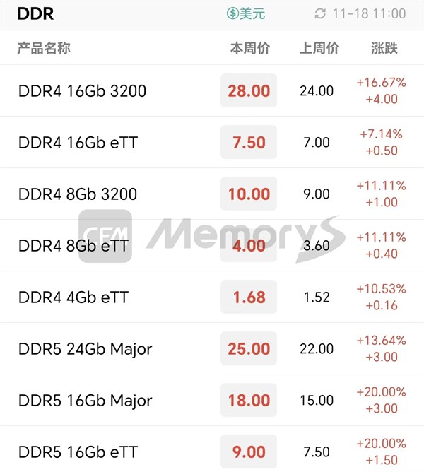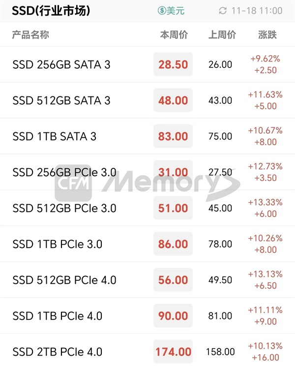 三季度以来,上游相继控制资源供应并放缓出货节奏,甚至部分DRAM资源供应按下暂停键。而转眼间,时间来到今年最后一个季度的后半段,上游供应未见好转的同时市场持续消耗库存,现货市场存储供需矛盾愈演愈烈,更加强化了存储厂商控货惜售心态。资源供应全面收紧持续影响下,存储成品端多数产品延续涨价趋势。