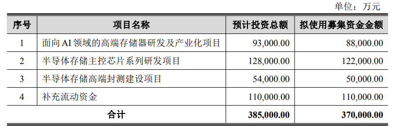 其中,面向AI领域的高端存储器研发及产业化项目总投资额为9.3亿元,拟投入募集资金8.8亿元;半导体存储主控芯片系列研发项目总投资额为12.8亿元,拟投入募集资金12.2亿元;半导体存储高端封测建设项目总投资额为5.4亿元,拟使用募集资金5亿元;补充流动资金预计投资总额为11亿,拟使用募集资金11亿元。
