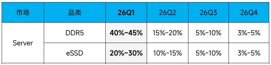 CFM闪存市场近日发布2026年存储市场展望报告。报告指出,预计2026一季度,服务器eSSD和DDR5 RDIMM仍存在较大供应缺口,预计DDR5 RDIMM大幅上涨40%以上,eSSD上涨20%~30%。