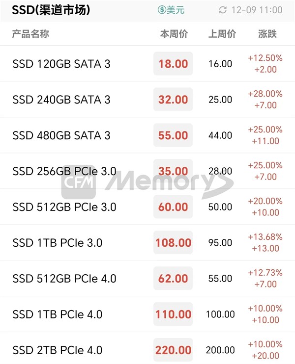 四季度以来,渠道SSD价格全面大幅涨价,截至目前,渠道SSD价格普遍上涨150%,甚至个别容量产品涨幅超两倍。当前,部分渠道厂商基于今年全年业绩已圆满完成,在控制接单量的基础之上继续抬高报价并不断挑战新的价格高度,并且针对新成交订单延长交付时间。另外,当前渠道SSD和内存条价格过高,部分渠道客户已无法消化高成本风险,未来将加速市场出清。