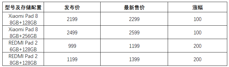 近日,多家线上销售渠道信息显示,小米多款在售平板电脑价格出现上调,涨幅100至200元不等。其中,小米平板8起售价由2199元调整为2299元;定位更高的小米平板8 Pro起售价从2799元上涨至2899元。而入门级产品Redmi Pad 2受影响较为明显,全系列价格上涨200元,起售价从999元升至1199元,涨幅约20%。