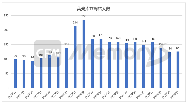 截至该财季末,美光库存为82亿美元,环比下降1.5亿美元,库存天数为126天。DRAM的库存天数仍然紧张,低于120天。