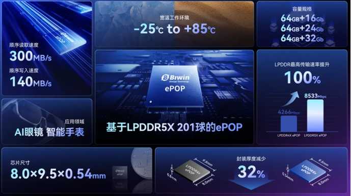 佰维基于LPDDR5X 201球的ePOP产品,凭借超小体积、低功耗、高性能、高可靠性等优势,精准适配高端智能穿戴、移动智能设备需求,从存储端全面提升设备使用体验。