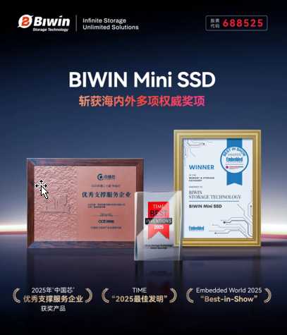 此外,产品实力也赢得了国际权威机构的认可,Mini SSD先后摘得《TIME》“2025年度最佳发明”、Embedded World 2025“Best-in-Show”大奖;公司亦凭借在该产品上的创新突破,荣获“2025年‘中国芯’优秀支撑服务企业”称号。如今,随着 Mini SSD 在 GPD、壹号本等多款旗舰设备中的成功应用,佰维将持续携手全球整机品牌、产业链伙伴及行业标准组织,推动这一创新形态走向规模化普及,让创新存储技术真正惠及每一位用户。