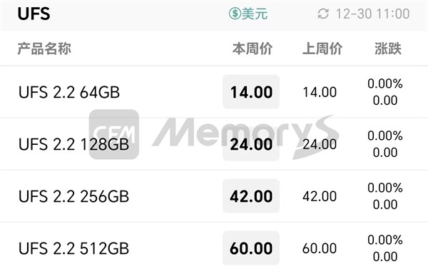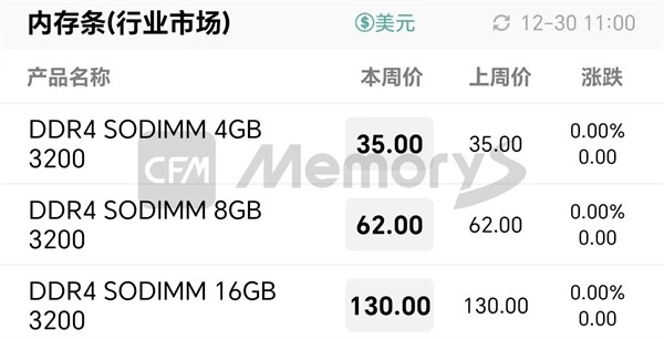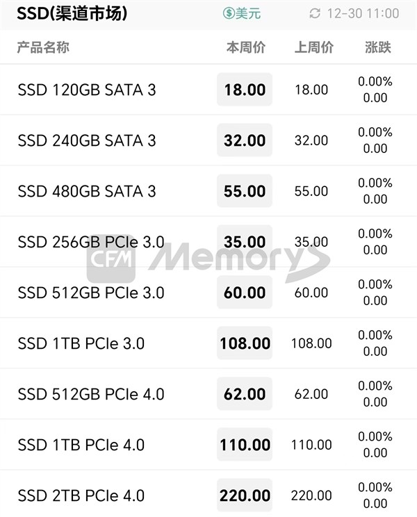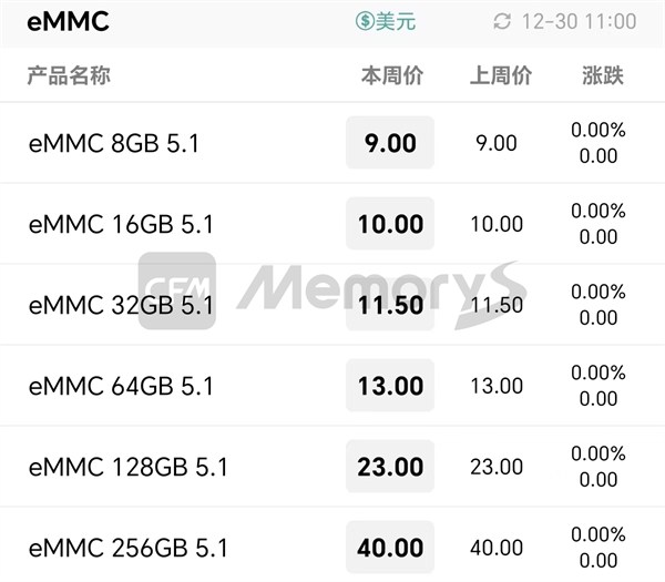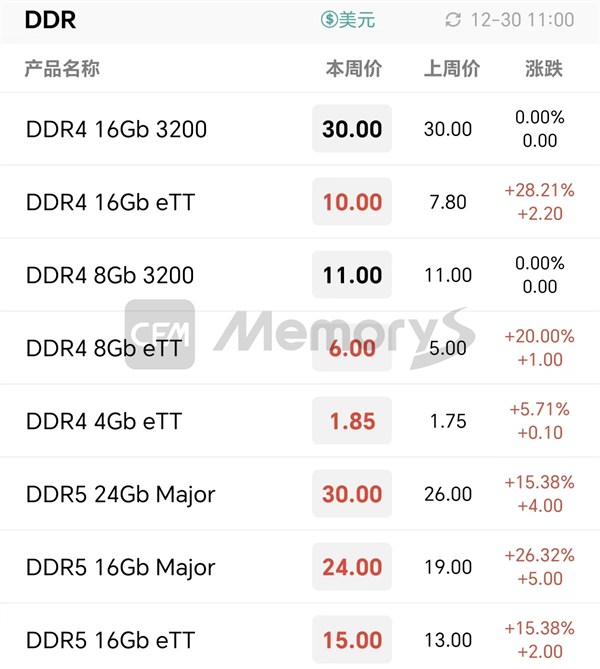 上游资源方面,部分Flash Wafer价格上涨,512Gb TLC 涨 9.09% 至 $12.00,其他价格暂时不变;DDR方面,DDR4 16Gb eTT 涨 28.21% 至 $10.00,DDR4 8Gb eTT 涨 20.00% 至 $6.00,DDR4 4Gb eTT 涨 5.71% 至 $1.85,DDR5 24Gb Major 涨 15.38% 至 $30.00,DDR5 16Gb Major 涨 26.32% 至 $24.00,DDR5 16Gb eTT 涨 15.38% 至 $15.00。