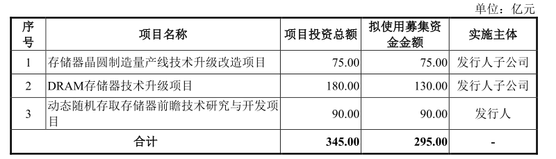 长鑫存储拟募资295亿元,用于存储器晶圆制造量产线技术升级改造项目、DRAM存储器技术升级项目以及动态随机存取存储器前瞻技术研究与开发项目。其中,存储器晶圆制造量产线技术升级改造项目总投资额为75亿元,拟投入募集资金75亿元;DRAM存储器技术升级项目总投资额为180亿元,拟投入募集资金130亿元;动态随机存取存储器前瞻技术研究与开发项目总投资额为90亿元,拟投入募集资金90亿元。