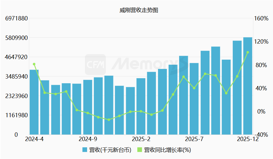 威刚2025年12月合并营收58.1亿元(新台币,下同),同比大增101%,环比增长3.79%。其中,DRAM营收占比69%,SSD占比21.6%,存储卡与U盘与其他产品9.4%。