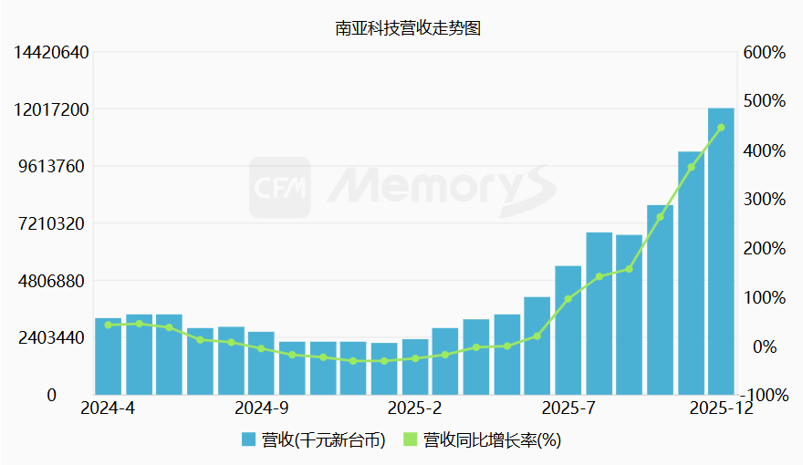 南亚科2025年12月合并营收达120.17亿元(新台币,下同),环比增长18.18%,同比暴增444.87%,连续第二个月改写新高。市场需求复苏是其推升12月营收创高的主要动能。