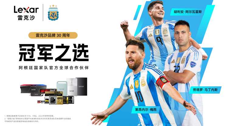 值此Lexar雷克沙品牌成立30周年之际,与世界杯卫冕冠军阿根廷国家队同步官宣,正式达成官方全球合作伙伴关系。据阿根廷国家队官宣信息,Lexar雷克沙是其2026年度首个官方全球合作伙伴。
