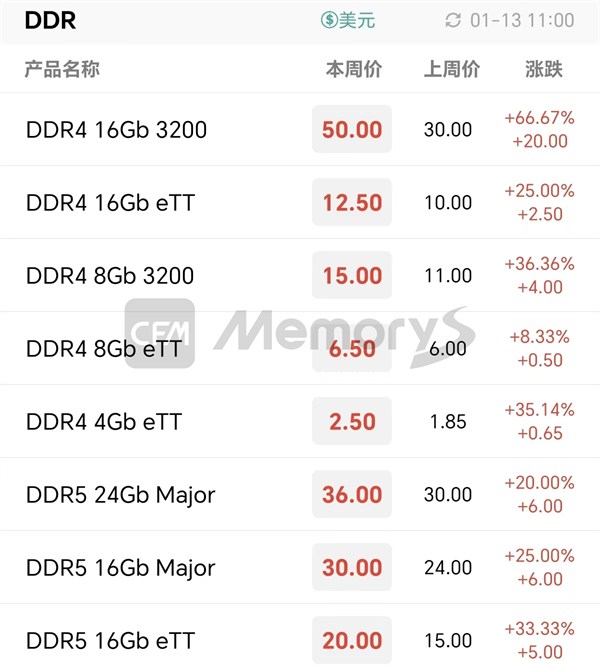 近期,据了解部分原厂面向mobile客户Q1 LP4X临时报价环比大幅上涨40%左右,最后落地价格还未有定论,而去年Q4存储厂商的生产成本甚至已超过该报价,考虑到Q1 LP4X资源价格仍将进一步走高,若此前旧库存水平较低,那么存储厂商Q1面向Tier1客户的出货盈利空间将大幅缩窄。当前,主要核心客户与非Tier1客户之间存在明显的价差,也为存储厂商带来较大的定价挑战。当前“面粉比面包贵”的局面难有改善,加上市场对接下来的行情普遍看涨,本周存储厂商全面调涨LPDDR4X产品价格,相应的集成式产品跟涨。