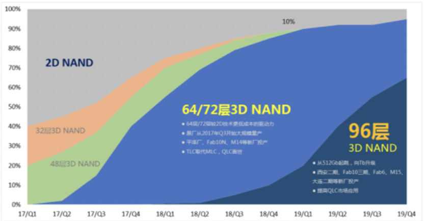 2018年上半年Flash原厂三星、东芝/西部数据、美光/英特尔、SK海力士,以及中国企业在投资、建厂、扩产等方面展开竞赛,下半年原厂又在96层和QLC创新技术上竞争激烈,使得2018全年NAND Flash供应大幅度增加40%,消费类NAND Flash市场价格更是大跌65%。