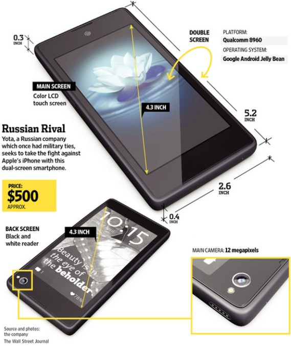 据外媒报道,俄罗斯手机生产商Yota Devices计划推出正面为传统LCD屏,背面为电子纸张黑白屏的双屏幕Android智能手机。该手机将于明年二月在巴塞罗那召开的世界移动大会上展出,产品售价约为500美元——低于苹果iPhone的售价,与一线Android智能手机价格水平持平。