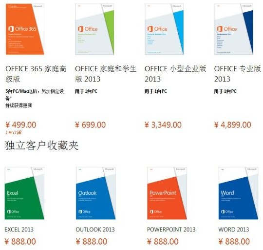 此外,微软还在国内市场销售单一功能的WORD 2013、EXCEL 2013、OUTLOOK 2013、POWERPOINT 2013,售价一致为888元。