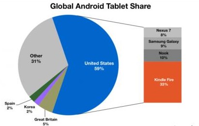 据Localytics移动应用分析公司报道,美国亚马逊公司出品的售价为96英镑的Kindle Fire平板电脑颠覆了人们心中安卓系统平板电脑较为低端的固有理念。Localytics 移动应用分析公司的此项调研共选择了5亿名不同的用户进行咨询。调查结果显示,在美国安卓系统平板电脑很畅销,占总销量的59%,而Kindle Fire平板电脑属于安卓平板电脑中的佼佼者,占美国平板电脑总销量的37%。