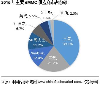 2015年eMMC市场依然是三星、东芝、闪迪、美光、SK海力士占据80%以上的市场份额,其中三星eMMC大约占39.1%、东芝21.2%、美光5.5%、SK海力士11.2%、闪迪12.4%,江波龙6.7%,金士顿1.6%,其他2.3%。