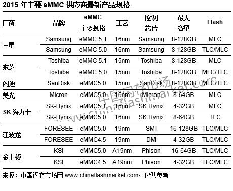 2015年2月J EDEC固态技术协会发布eMMC5.1规范,三星和东芝率先推出eMMC5.1,三星采用16nm量产TLC/MLC eMMC 5.1,东芝eMMC 5.1采用最新15nm工艺,提供128GB大容量满足市场需求,下半年开始采用15nm TLC量产eMMC降低成本。闪迪、SK海力士、美光等eMMC 5.0则采用1ynm TLC降低成本,同时江波龙、金士顿等模组厂也进入eMMC5.0量产出货阶段,加速市场由eMMC4.5全面向eMMC5.0普及。