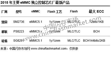 以前由于TLC仅1000次的擦写寿命,而且传输速度偏低,TLC eMMC仅用在低端智能型手机、平板、OTT盒子等市场。随着Flash原厂TLC技术不断成熟,且慧荣、群联、硅格等eMMC控制芯片提高ECC的纠错能力,增强TLC耐用性,TLC eMMC性能已基本能达到MLC eMMC水平,且容量和成本更能满足智能型手机对64GB和128GB的需求。