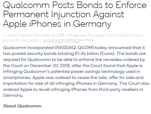2018年12月21日,高通宣布慕尼黑地区法院认定苹果侵犯高通与降低智能手机功耗有关的知识产权,并授予了高通所请求的iPhone永久禁令。12月10日,高通赢得了中国福州市中级人民法院的一项初步禁令。法院裁定,苹果侵犯了高通的两项专利,禁止苹果向中国进口和销售多款iPhone机型,包括iPhone 6S、iPhone 6S Plus、iPhone 7、iPhone 7 Plus、iPhone 8、iPhone 8 Plus和iPhone X。随后,高通又向北京、青岛和广州法院提交了附加诉讼,请求禁售苹果最新款iPhone XS、iPhone XS Max和iPhone XR手机。