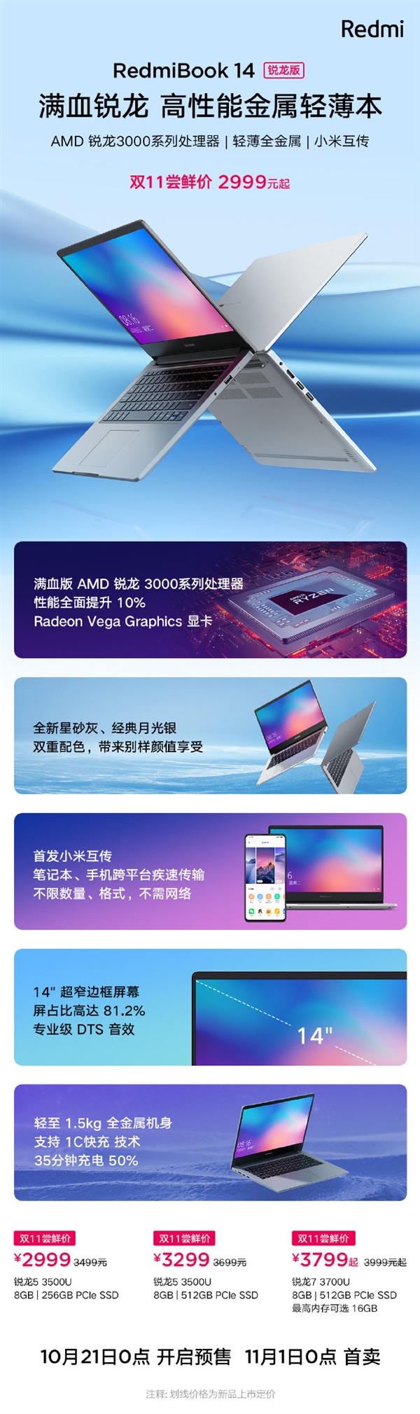 RedmiBook14锐龙版将于10月21日0点开启预售,11月1日0点首卖。