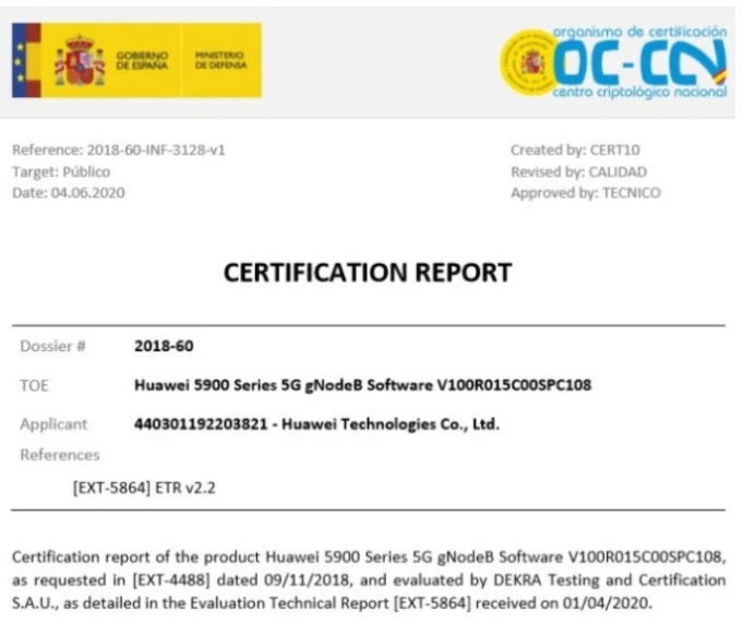 此次通过CC认证的产品是“华为5900系列5G吉诺德比(音译:下同)软件(SW)”。产品名称中,“吉诺德比”是指移动通信标准化组织3GPP制定的5G基站。
