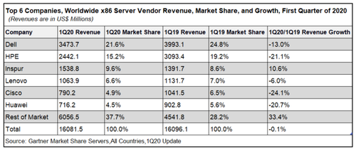 市场表现上,第一季度全球服务器市场厂商销售额前三名依次是戴尔、HPE、浪潮。戴尔厂商销售额同比下降13.0%,市场份额为21.6%;HPE厂商销售额同比下降21.1%,市场份额为15.2%;浪潮厂商销售额同比增长10.6%,是全球唯一实现两位数增长的厂商。