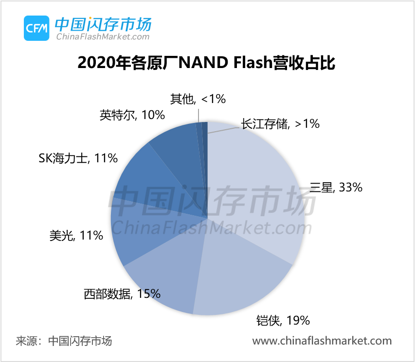 在2020年,Kioxia的收入达到11634亿日元(约111.8亿美元),同比增长25%;其利润水平也由去年的1958亿日元(约18亿美元)的巨幅亏损,扭亏为盈,达到63亿日元(约0.6亿美元)的盈利水平。据闪存市场数据显示,2020年铠侠以19.3%的市场份额占据全球第二大NAND Flash供应商地位,仅次于三星。