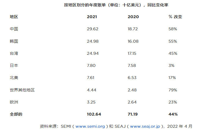 2021年全球晶圆加工设备销售额增长44%,而其他前端细分市场销售额增长 22%。组装和封装在所有地区都呈现出非凡的增长,导致2021年市场增长87%,而测试设备总销售额增长30%。
